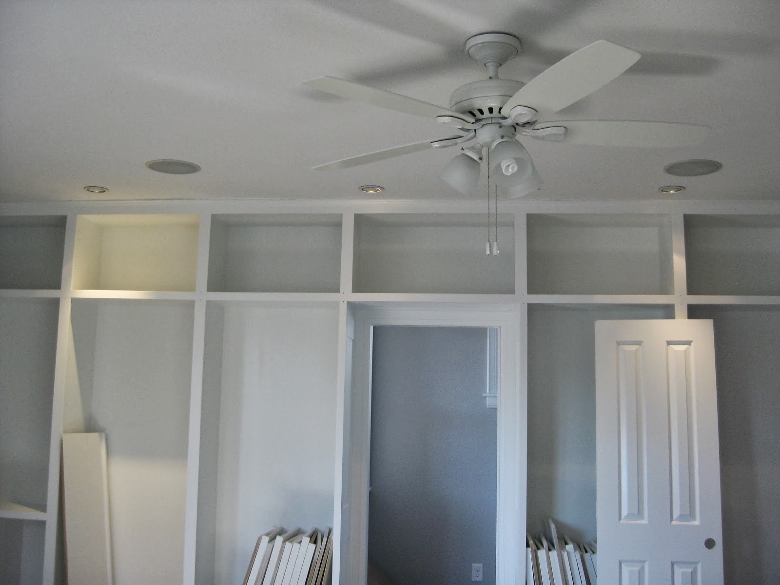 The ceiling of the gathering room now has recessed canister lights, a ceiling fan, low-voltage "wall washer" lights and ceiling-mounted speakers for the surround sound system.